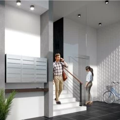 Der Wandbriefkasten ,,Comic“ im klassischen Design ist ein flexibler Dreifachbriefkasten zur Aufputzmontage. Der Briefkasten kann sowohl alleinstehend, als auch in einer Briefkastenanlage montiert werden. Hierbei kann er sowohl neben-, als auch untereinander angeordnet werden. Einwurf und Entnahme erfolgen bei diesem Modell von vorne über die Einwurfklappe und eine aufgesetzte Frontklappe. Die Schlösser befinden sich witterungsgeschützt unterhalb der Einwurfklappe, wodurch auch das klare Design nicht unterbrochen wird