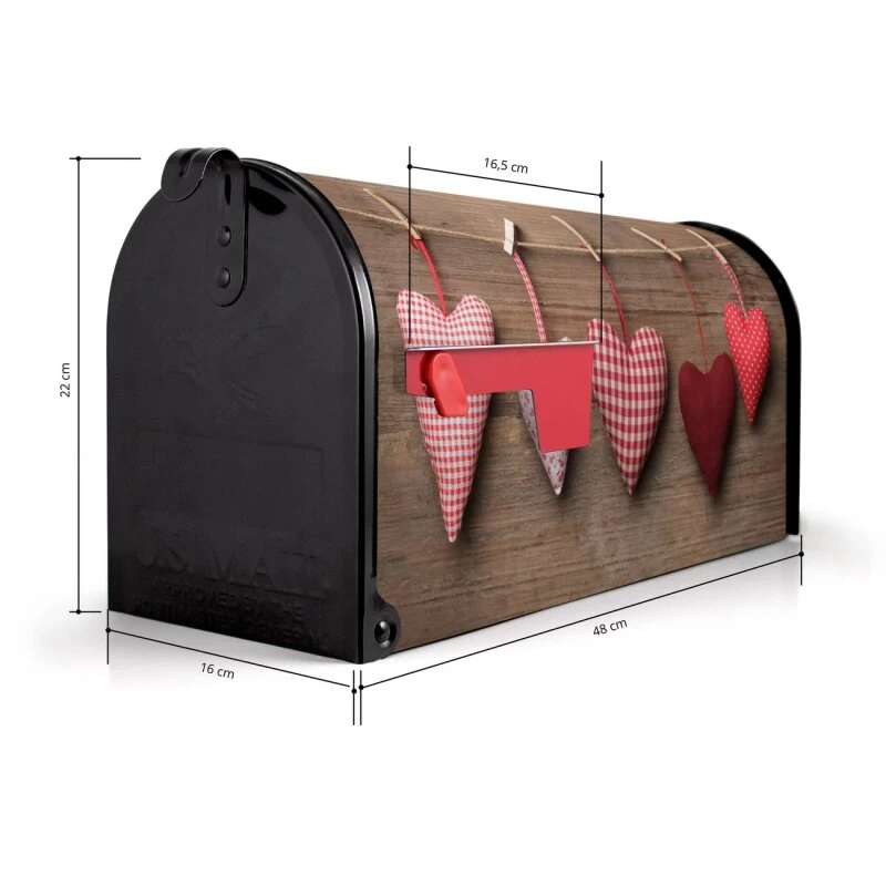 Der amerikanische Briefkasten mit Herzen Motiv bietet Ihnen ausreichend Fassungsvermögen, um große A4 Sendungen und Zeitschriften zu empfangen. Die typisch amerikanische rote Fahne zeigt Ihnen an, wenn Sie Post erhalten haben. Die US-Mailbox besteht aus verzinktem Stahlblech welches lackiert wurde und ist 48 x 22 x 16 CM (BxHxT) groß. Die Folie mit Motiv Herzen besteht aus einer wetter- und UV-resistenten Folie, die mit einem Schutzlaminat überzogen ist, sodass die US Mailbox zusätzlich vor Kratzern geschützt ist. An der Unterkante sind 4 Löcher je Seite um die Mailbox, typisch amerikanisch, an einem Holzpfahl oder einem Zaun zu befestigen.