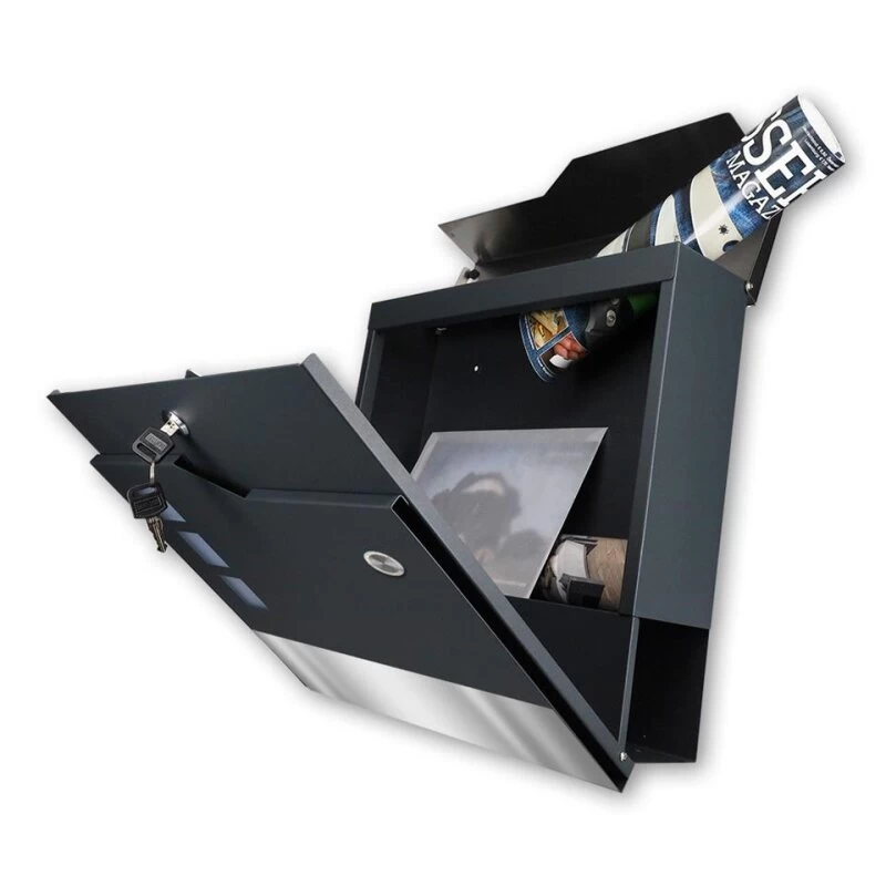 Designer Funk Briefkasten der Besonderen Art in zeitlos schicker Optik. Der Briefkasten verfügt über einen großen Briefschlitz, ist abschließbar und wird mit zwei Schlüsseln geliefert. Montagematerial ist ebenfalls im Lieferumfang enthalten. Weiter befindet sich auf der unteren Seite ein Zeitungsfach, so dass Zeitungen nicht mehr vor der Haustüre im Nassen abgelegt werden müssen, sondern einen trockenen Platz haben, bis sie ins Haus geholt werden. Die Beschriftung erfolgt im Lasercut-Verfahren und ist ein echtes Highlight.