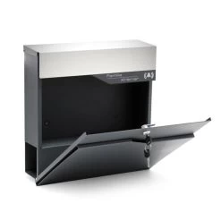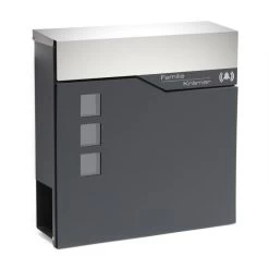 Designer Briefkasten aus galvanisiertem Stahl mit pulverbeschichteter Oberfläche in zeitlos schicker Optik. Der Briefkasten verfügt über einen großen Briefschlitz, so dass auch größere Sendungen eingeworfen werden können. Montage-Material ist ebenfalls im Lieferumfang enthalten. Weiter befindet sich auf der unteren Seite ein Zeitungsfach, so dass Zeitungen nicht mehr vor der Haustüre im Nassen abgelegt werden müssen, sondern einen trockenen Platz haben, bis sie ins Haus geholt werden.