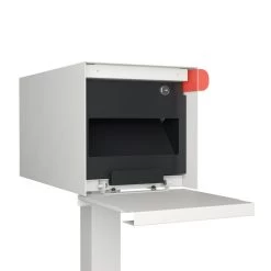 Als freistehender Einzelbriefkasten eignet er sich für die Bodenmontage auf freier Fläche. Einwurf und Entnahme erfolgen an der Vorderseite über eine massive Frontklappe und ein dahinterliegendes Innentor mit integriertem Einwurfschlitz und Schloss. Das Besondere: Der eingriffsichere Schlitz ermöglich den Einwurf kleiner Päckchen. Die massive Frontklappe schützt das Innentor vor Witterung und lässt sich als stilistisches Element individuell gestalten.