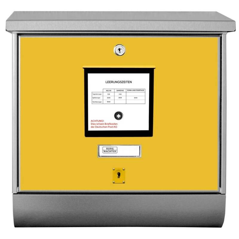 Der BURG-WÄCHTER Edelstahl Briefkasten mit Motiv Briefkasten Gelb und Zeitungsrolle bietet Ihnen mit seinem Fassungsvermögen genügend Platz auch für große A4 Sendungen und Zeitschriften. Das integrierte Regendach schützt Ihre Post vor dem Eindringen von Regen.