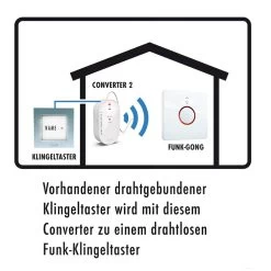 Der Mini-Funkconverter (Sender) wird direkt an der Klingelleitung oder versteckt im Gehäuse Ihres vorhandenen Gongs angeschlossen und sendet ein Funk-Signal an Türglocken-Empfänger aus der BELL- und FG-Serie.