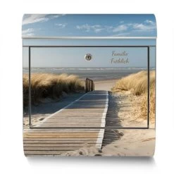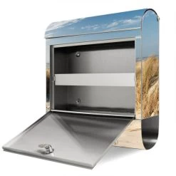 Der Edelstahl Briefkasten mit Wunschtext und Motiv Dünen bietet Ihnen mit seinem Fassungsvermögen genügend Platz auch für große A4 Sendungen. Das integrierte Zeitungsfach eignet sich hervorragend um unkompliziert die Tageszeitung zu fassen.