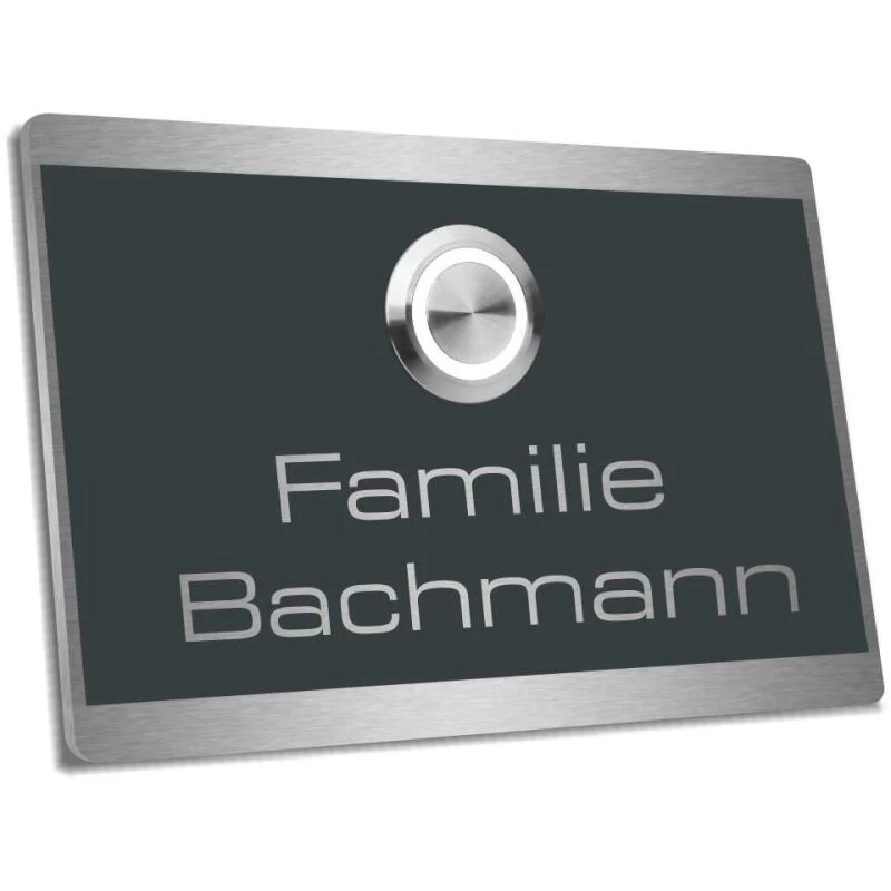 Sehr hochwertig und mondän wirkt diese Haustürklingel in Anthrazit. Sie besteht aus einer Edelstahlplatte, die pulverbeschichtet ist mit der RAL 7016. Am Oberen und unteren Rand sowie seitlich scheinen edle Edelstahlstreifen hervor. Diese Beschichtung ist absolut wetterfest und erleidet im Außenbereich keine Qualitätseinbußen. Durch ein Spezialverfahren wird die Pulverbeschichtung laut Ihrem Beschriftungswunsch wieder weggelasert. Jetzt erscheint die Schrift wieder in Silber, also in Edelstahl. Hier entsteht ein toller Glanzeffekt von Ihren Beschriftungstext.