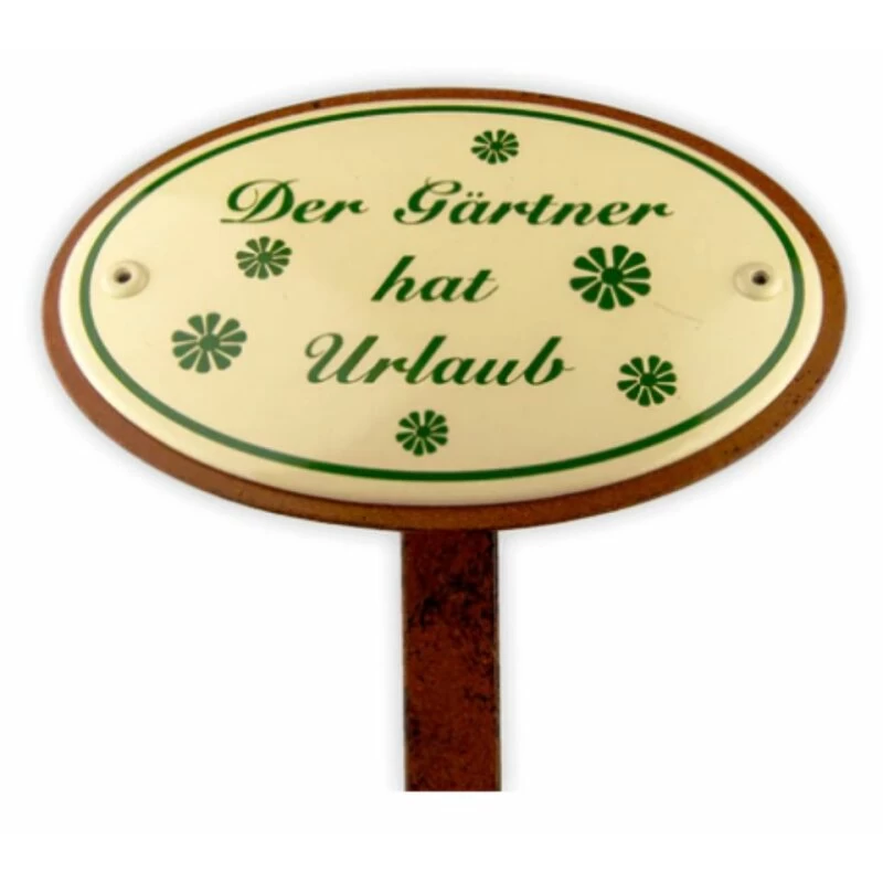 Emailschild oval, 15 x 10 cm, Der Gärtner hat Urlaub, mit Erdspieß