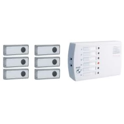 Für bis zu 6 Personen, Räume oder Eingänge – Empfangszentrale zeigt optisch und akustisch den auslösenden Sender an. Ideal für Arztpraxen, Senioren- und Behindertenpflege, Pflegedienste, Kanzleien, Büros, Gastronomie etc.