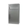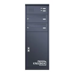 Die hier gezeigte Modellvariante ist freistehend in Stelenoptik mit einer Designverkleidung RI234 inklusive Regenkante für den Witterungsschutz bei Zustellung und Entnahme. Zustellung und Entnahme erfolgen sowohl für Pakete als auch für Briefe von vorn. Der Briefkasten (EN 13724 konform) ist mit flächenbündigem Namensschild sowie einen Funktionskasten für einen Teilnehmer, der mit einem Edelstahl-Klingeltaster, einem weiteren Namensschild sowie einem Sprechsieb ausgerüstet. Die Stromzuführung zum Funktionskasten geschieht über ein Leerrohr auf der linken Seite der Verkleidung (von vorn gesehen), das wir mit einem entsprechenden Fädeldraht vorbereitet haben.