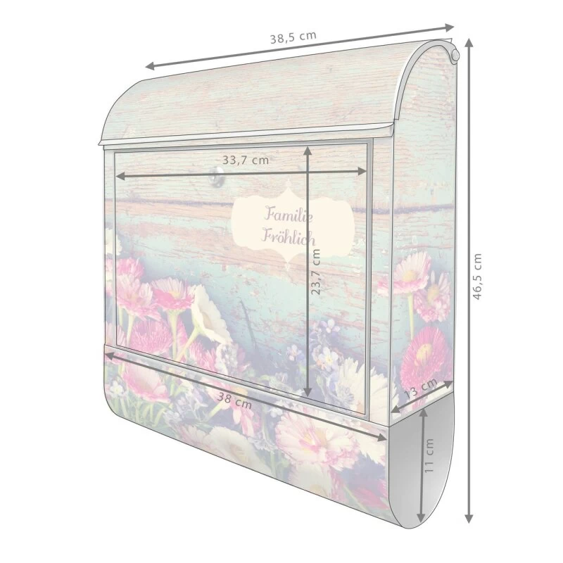 Der Postkasten mit Motiv Blumenpfücken hat ein sehr ansprechendes und ausgefallenes Design, damit entlocken Sie Ihren Nachbarn und dem Postboten ein Lächeln. Heben Sie Sich von der tristen grauen Masse ab, ohne auf Funktionalität zu verzichten.
